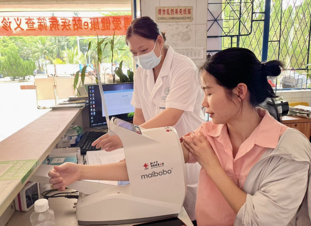 ▲2024年4月,中国红十字基金会在海南省白沙黎族自治县援建的“红十字博爱健康e站”中,医务人员为群众筛查义诊。