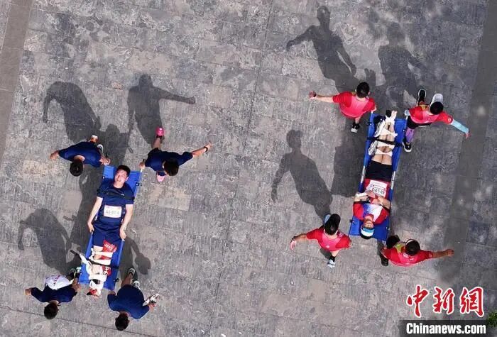 ▲参赛队伍参与担架搬运应急救护任务。中新网记者 泱波 摄