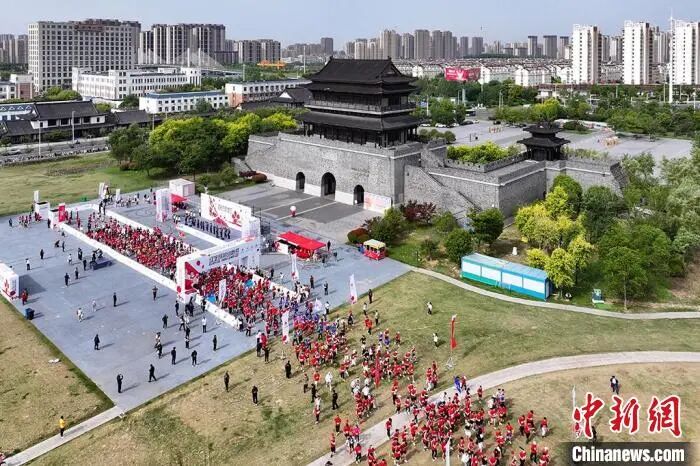 ▲参赛队伍从淮安漕运门东广场出发。中新网记者 泱波 摄