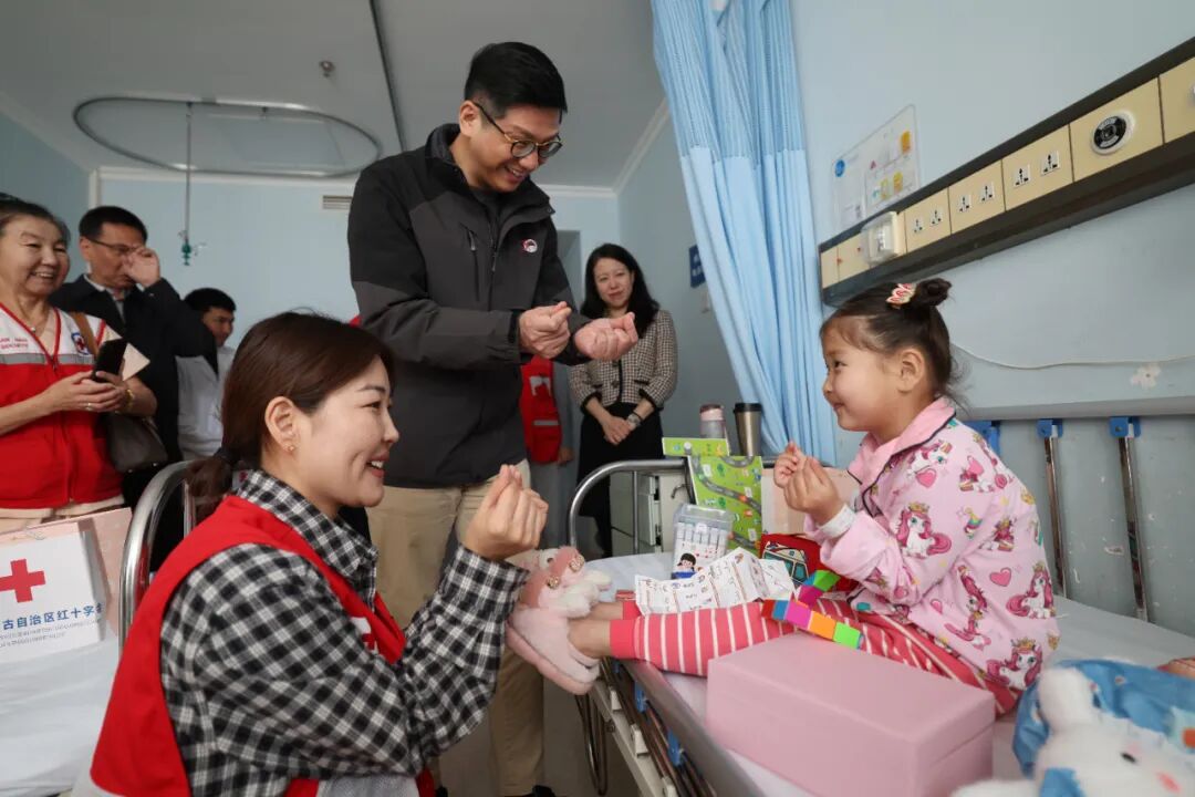 11月11日,蒙古国红十字会副秘书长巴雅尔其木格、中国红十字会总会联络部部长米娜、中国红十字基金会理事长贝晓超前往首都医科大学附属北京安贞医院探望正在接受治疗的14名蒙古国先心病患儿。中国红十字基金会副秘书长周魁庆,内蒙古自治区红十字会党组成员、副会长孟克宝音,首都医科大学附属北京安贞医院小儿心脏中心主任王强等陪同探望。