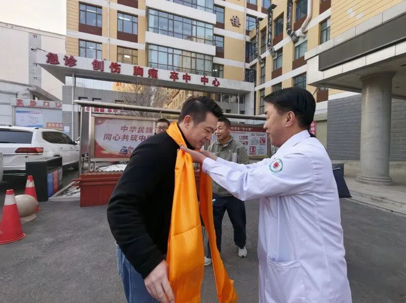 ▲当地医护人员为医疗队成员献上哈达。